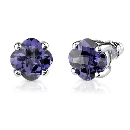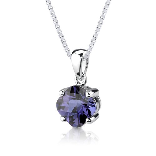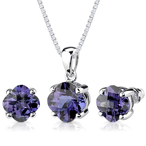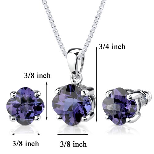Earrings = Simulated Alexandrite, 2 pieces Checkerboard-cut Lily Shape 9mm, total weight 3.00 carats. Earring Dimension: 3/8 x 3/8 inches. Pendant = Simulated Alexandrite, 1 piece Checkerboard-cut Lily Shape 10mm, total weight 5.25 carats. Pendant Dimensions: 7/8 x 1/2 inches. Earrings and Pendant have a total weight of 9.10 grams and are set in pure.925 Sterling Silver Rhodium Finish Rhodium Finish. Includes a 18" Sterling Silver Rhodium Finish Box Chain, Free Gift.