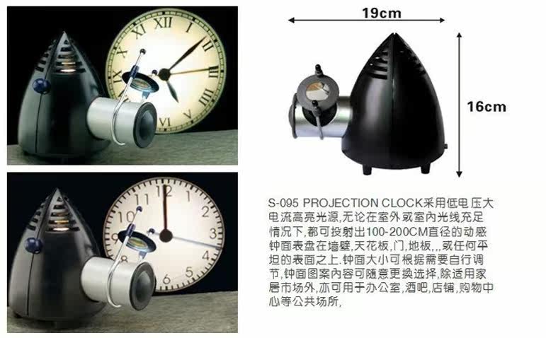 s-095IMAGE COLOCK highlight low voltage high current source, either outdoors or indoors in a well-lit situations, can cast a 100 ~ 200CM dynamic diameter clock face dial in walls, ceilings, doors, floors, or any flat above the surface. clock face size can be adjusted according to their own needs, the clock face pattern contents can easily be replaced, in addition to the applicable domestic market, but also for offices, bars, shops, shopping malls and other public places pass.