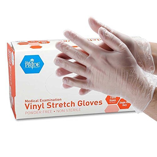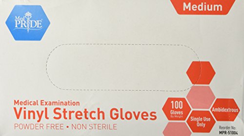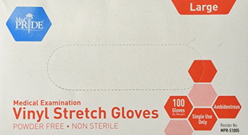 Studio : Sheild Line Publisher : Sheild Line Product Description MedPride stretch vinyl medical exam grade gloves provide the snug fit of latex at a much more economical price. They are made from 100 percent synthetic vinyl that is entirely latex-free and are crafted with strength and durability for support and comfort and features added stretchability for a skin conforming fit. The gloves are smooth, ambidextrous and versatile for various applications. The soft, solid fit and feel with enhanced protection makes these gloves an ideal option for sensitive hands. Gloves are non-sterile, lot controlled, disposable and designed for single use only. Meets ASTM standards. Case includes 10 boxes of 100 gloves, 1000 ct. 0