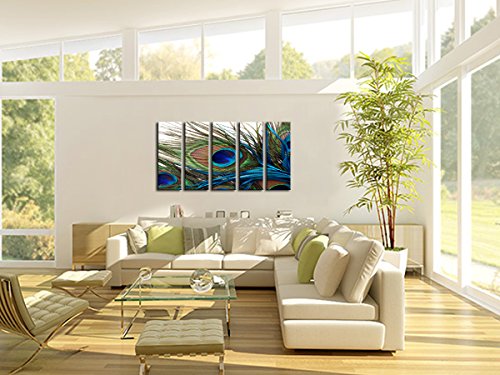 -. Title : Canvas P.R.Ints Wall Art Peacock Feathers Painting Bird Plume Modern Art for Living Room Decoration Ready to Hang set of 5