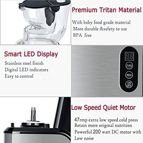 LOW SPEED MINIMAL OXIDATION MASTICATING JUICER -- Highly anti-oxidant,the nutrition centre slow juicer extract more the nutrients and enzymes and minerals compared to centrifugal juicers.And Aobosi slow juicers has a 200W heavy duty powerful DC Motor with low speed of 47-60 RPM that has long continuous working time(10mins).Aobosi extra-slow masticating juice extractor prevents all the vitamins, enzymes, minerals and trace minerals from loss during the masticating process.