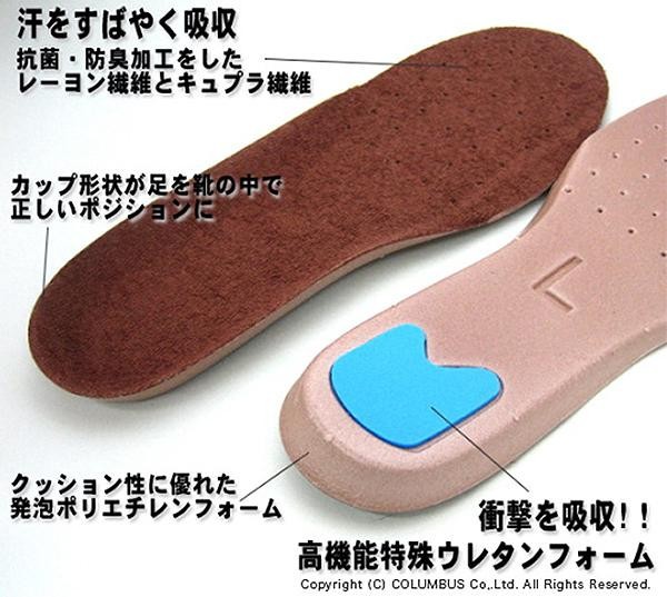 | 汗をすばやく吸収しムレを防ぎます。クッション性に優れた発泡ポリエチレンフォームが足をやさしく包みます。かかと部分のカップ形状が足を靴の中で正しいポジションに固定し、高性能特殊ウレタンフォームが歩行時にかかと部分が受ける衝撃を吸収します。 |
