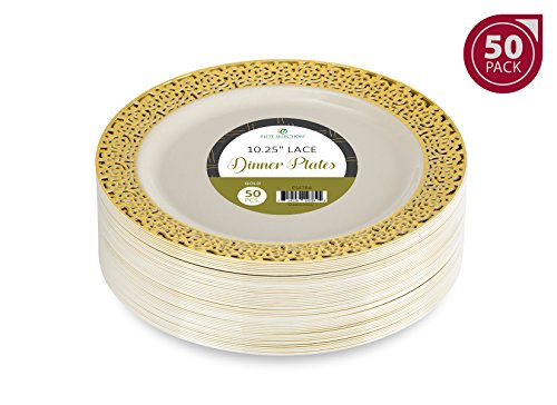 Elite Selection Pack Of 50 Dinner Disposable Plastic Plates Ivory Color With Gold Lace Rim 10.25 Inch