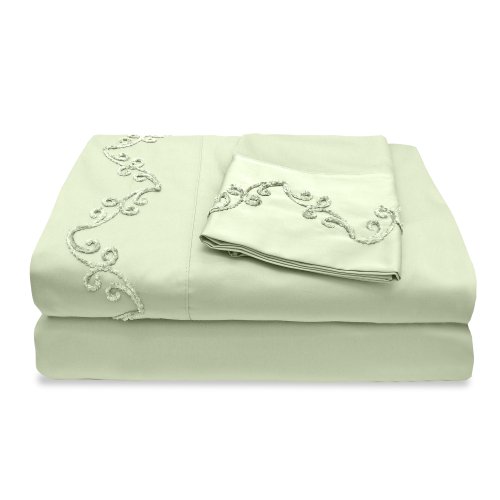 Veratex The Chenille Scroll Collection 100% Egyptian Cotton Sateen 300 Thread Count King Size Sheet Set With Elegant Stitch Hem Design, Sage