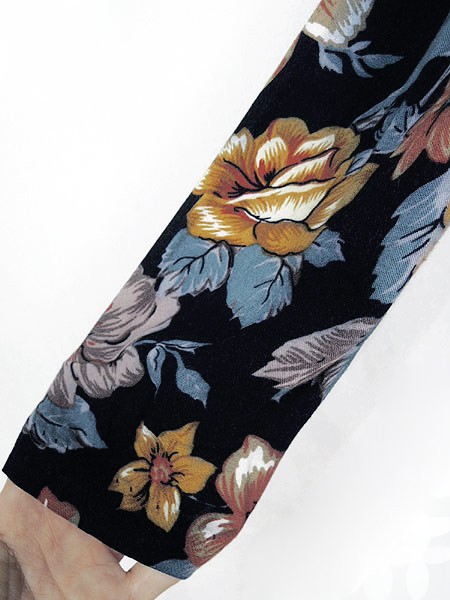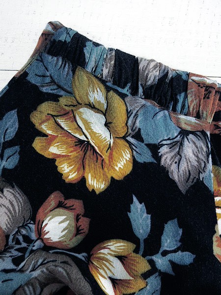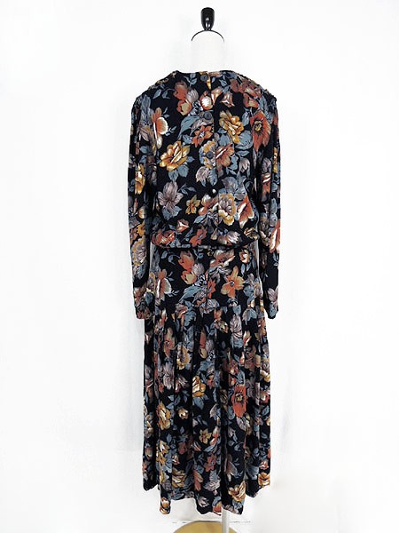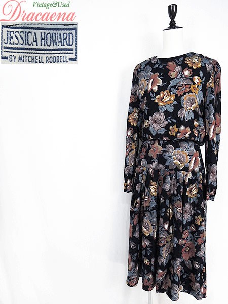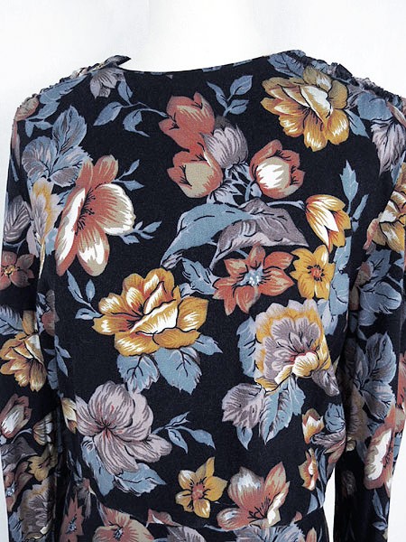 クラシカルな古着らしい花柄ワンピース。両肩にギャザー、ウェストコルセット風、プリーツスカートのデザイン◎。裏地なし。素材全体に色にじみあり。後ろボタンに付け替え跡あり。