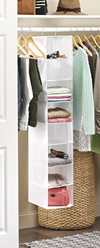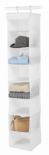 - This hanging organizer has 8 easy access shelves to hold clothing, shoes, scarves or accessories