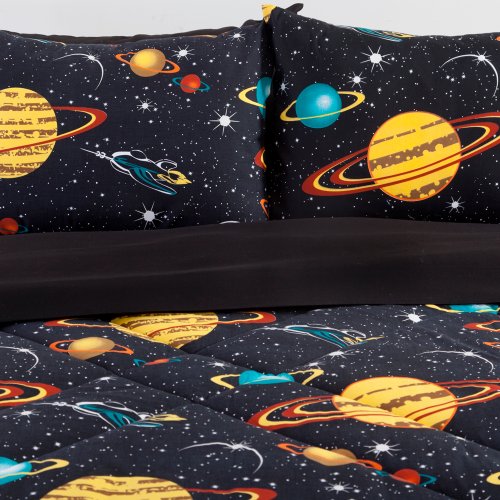 The Veratex Rocket Star Bedding Collection for kids features sheet sets and comforter sets that can be eloquently and seamlessly paired together. The sheets, bed skirts and shams are of a pure black color, effectively enhancing the décor in many kids rooms by their own virtue. The comforter and matching pillowcases, however, are the true source of glory. Each comforter and pillowcase features a black backdrop with truly dazzling planet and star patterned imagery, in bright and beautiful colors that glow vividly in the dark. This collection is simply out of this world. Twin, queen and full sizes are available; twin size sets contain 3 items while queen and full contain 4. Veratex is a true leader in the industry of sophisticated and divine textiles. They take pride in cherishing a unique and elegant vision that proudly embraces intricately woven designs, stylish color tones and soft, luxurious textures to create classic yet stunningly magnificent products.Feature