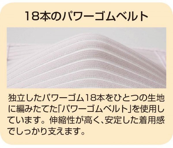 腰椎を強力にサポートしながらも、18本のパワーゴムベルトでしなやかで柔軟なフィット感が体感できます。
