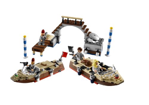 The guardians of the Grail are in hot pursuit! Escaping through the canals of Venice with the map to the Holy Grail, Indy and Elsa are chased by a secret order of guardians sworn to prevent the Grail from being discovered! Are a collapsing pier and a blast-apart boat enough to get them out of danger? Includes Indiana Jones, Dr. Elsa Schneider and 2 Grail Guardian figures. Recreate the exciting adventure from the movie The Last Crusade! Includes 4 minifigures: Indiana Jones, Dr. Elsa Schneider and 2 Grail Guardian figures! Features a collapsing bridge, breakable boat bottom, exploding motor, and secret manhole hiding place! Each boat measures 6¾ inches (17.1cm) long!Feature