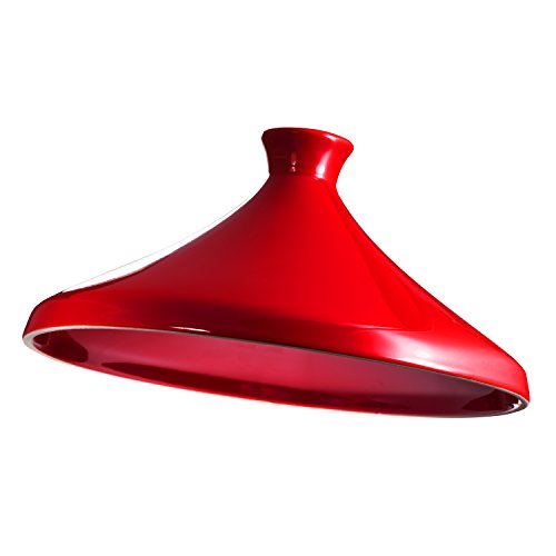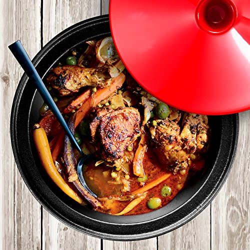 Studio : Bruntmor Publisher : Bruntmor Product Description This new 4 quart tagine from Bruntmor is a magical cast iron pot suited for various types of cooking. Use for everything from meat to vegetables! 4 quart Moroccan Tagine made of cast iron and colorful stoneware. Generous rim allows for a secure grip during transport. The conical lid allows steam to circulate during cooking, which then creates condensation that drips back onto the meat, fish, or veggies, keeping food moist. Hand washing recommended; oven-safe up to 500 degrees F. The beautiful bright red pot is perfect for entertaining. 0