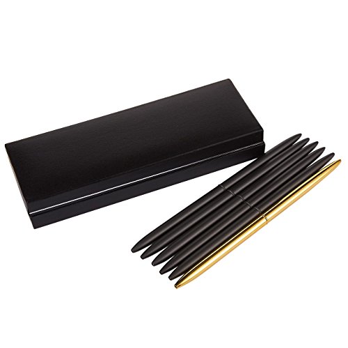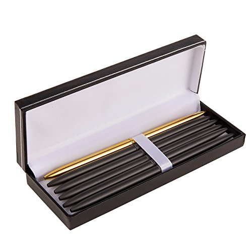 -. Feature : BULK BALLPOINT PENS: This ballpoint pen set includes 6 pens in each package. The ball point tip is released by twisting the lower half of the pen. Black ink is dispensed over the metal ball point that is 0.7mm in diameter. It also comes with a black storage case that fits all 6 pens. / SLEEK DESIGN: These classic ballpoint pens are plated with a metallic finish giving it a touch of elegance and a sleek and professional feel. 5 pens are plated in gun black and 1 plated in gold. With the twist release of the ball point design, you will never have to worry about losing the cap and drying out the ink. / SMOOTH WRITING EXPERIENCE: This pen provides a smooth writing experience, enhancing your handwriting by making your fine lines more crisp and clear. / GIFT READY BOX: This package comes with a black gift ready box that fits all 6 pens. The inner lining of the box is white and the pens are secured with a ribbon. / DIMENSIONS: Each pen measures 6.2 inches. The black pen case measures 6.8 x 1.1 x 2.5 inches.