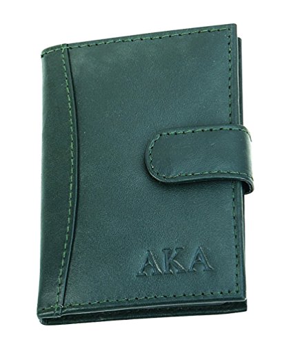 Product DescriptionAlpha Kappa Alpha sorority green with AKA credit card holder/wallet. Genuine leather, AKA Greek letters embossed. 3.0 wide and 4 inches length. Has 20 credit card holders. Each side can hold 3 cards more. Snap closure.0