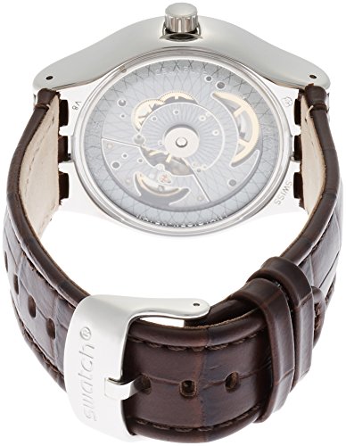 Swatch YIS404 Sistem51 Irony Sistem Fly men's automatic watch features a 42mm wide and 14mm thick solid stainless steel case with a fixed bezel and textured push-pull crown. Swatch YIS404 is powered by Swiss automatic movement. This stylish watch also features a textured shiny sunray blue dial with white accents silver tone luminous hands and Arabic numeral hour markers along with the date display function, scratch resistant acrylic crystal and water resistant to 30 meters. Swatch YIS404 is equipped with a 21mm wide brown stitched genuine brown leather strap with a buckle clasp. Swatch YIS404 men's Sistem51 Irony Sistem Fly automatic watch is brand new and comes in an original Swatch gift box and is backed by a 2 year My Gift Stop limited warranty.Feature