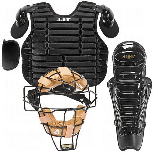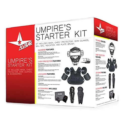 Studio : All Star Publisher : All Star Binding : Misc. Product Description All Star Umpires Starter Kit Everything You Need to Stay Safe at the Plate All Star Umpires Starter Kit features: Face Mask Leather interior, vinyl exterior chin and forehead pads Super light tubular steel frame with throat extension Chest Protector Multilayered construction uses low-bounce foam to deaden the ball Fully adjustable, flexible molded shoulder cap Exclusive collarbone protective pad Extra wide web straps for support and comfort Open mesh back cover with ventilated foam wicks away moisture Wraparound sides increase protection and top mounted hook-ups protect player and reduce wear on uniform Leg Guards EZ form triple knee design for comfort Triple layer of padding between knee and shin 38 strategically placed ventilation ports for Protected by AEGIS microbe shield Removable "Second Toe" for complete foot protection Knee caps extended on side increase protection Adjustable, removable patella padding system Full wing and ankle protection Charcoal Belt Bag Indicator Plate Brush All Star Baseball...Move Forward. Rise Above. 0
