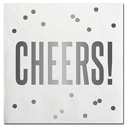 -. Feature : "Cheers!" Cocktail Napkins comes in a pack of 20 count / Napkins feature a white background with silver confetti and words "Cheers!" in silver on the cover. / Serve alongside drinks, snacks, and appetizers at your next party or gathering! / Napkins are disposable making after-party cleanup easy / Dimensions: 5 square inches folded, approx. 9 square inches open