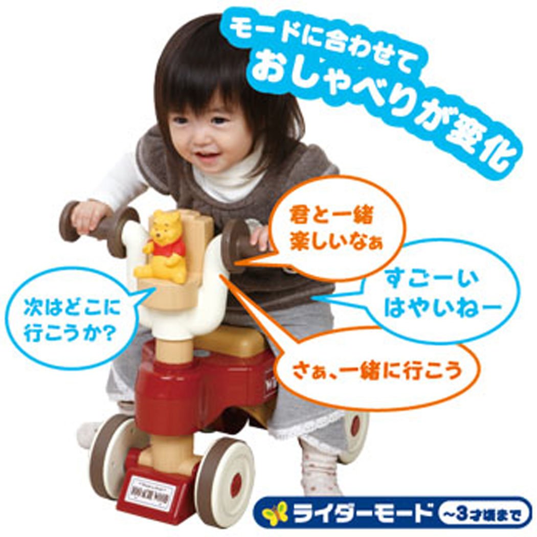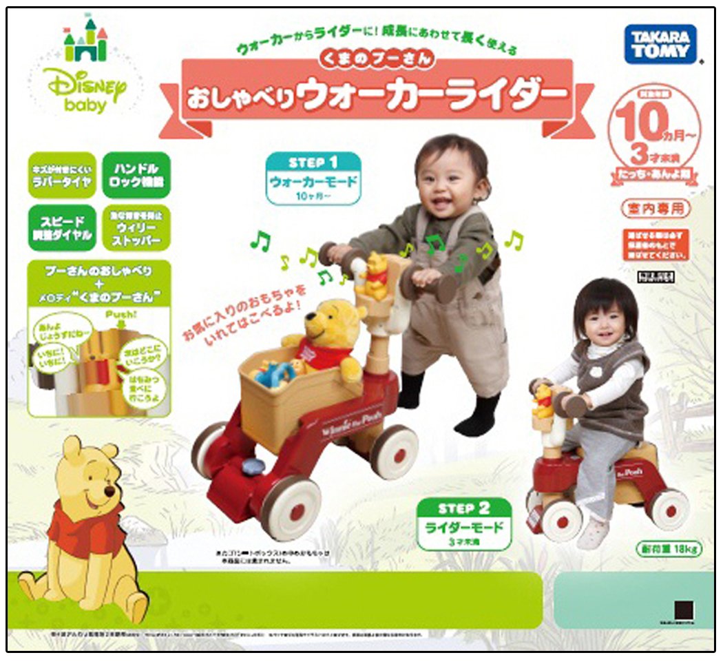 赤ちゃんの成長に合わせ、ウォーカーからライダーにへんしん! ウォーカーモードのカゴにはお気に入りのおもちゃを入れて運べます。 プーさんがたくさんおしゃべりしたり楽しい音楽も入って、遊んでいる中で赤ちゃんのあんよを促進。 ウォーカーモードでは「いちに、いちに」とリズムをとったり赤ちゃんのあんよを促す言葉を、ライダーモードでは「すごい!はやいねー」「次はどこに行こうか?」といった相乗りを楽しんでいるような言葉を話します。 よちよち歩きでも安心のブレーキ機能と、ライダーモードのみハンドルが切れる安全にも考慮した作りでお母さんも安心です。