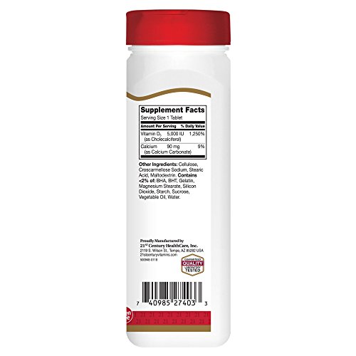 Studio : 21st Century Publisher : 21st Century Binding : Health and Beauty Product Description Vitamin D3 is essential for absorption of calcium to promote strong bones and teeth. Vitamin D3 also supports a healthy immune system and breast and colon health. Gluten free. No added sugar, yeast, preservatives or artificial flavors. 21st Century vitamins and supplements are manufactured in a CGMP facility under the strictest standards for product quality, including potency and purity. 21st Century prides itself on providing you with a great product at the best value. This statement has not been evaluated by the food and drug administration. This product is not intended to diagnose, treat, cure or prevent any disease. 0