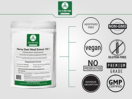Studio : Naturevibe Botanicals Publisher : Naturevibe Botanicals Binding : Health and Beauty Product Description Horny Goat Weed is a powerful formulated herb that enhances sex life in both men and women in the best natural way, also promotes graceful aging, supports skeletal health and regulates hormonal balance. Made with safe ingredients 100% Pure and Natural Horny Goat Weed Extract in form of powder support increased blood flow, performance, strength, libidinal energy, desires and stamina, resulting in much more satisfying climax.