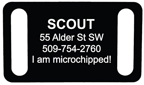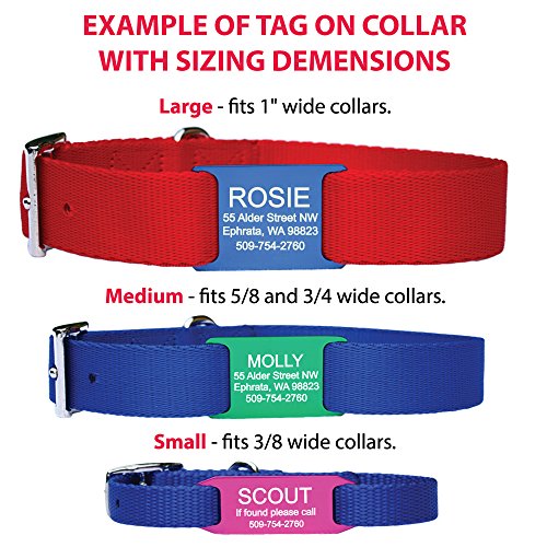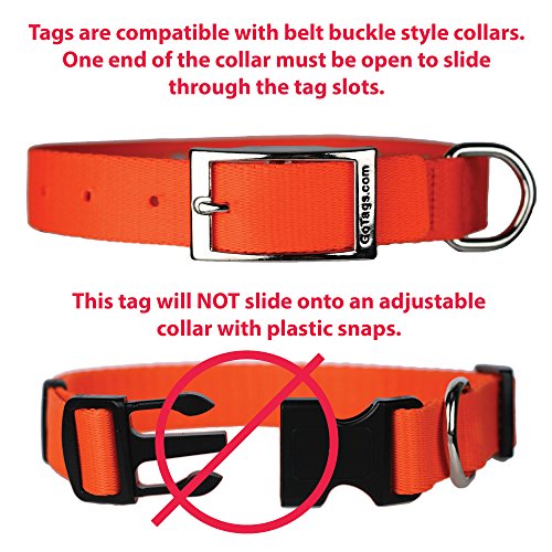 Studio : GoTags LLC -- Dropship Publisher : GoTags LLC -- Dropship Binding : Misc. Product Description Never lose a pet tag again. Our slide-on tag fits directly onto a belt buck style collar. Permanently laser engraved with up to 4 lines of Personalized text. Our aluminum tags go through an anodized process that adds strength, durability and Brightness of color to each tag. Clear, sharp and easy to read personalization. Please note that These tags are only compatible with belt buckle style closures since one end of the collar must be open to slide through the collar slots. 0