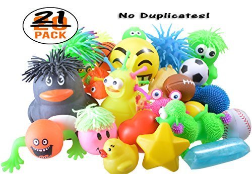Get 20 (plus 1 bonus) fun and colorful squishy stress balls and squeeze toys for one great low price! The Squishy Stress Balls and Toys Value Assortment can be used for classroom parties, home birthday parties and community events. In addition, they're perfect for treasure chests at doctors' and dentists' offices and for stocking up on occupational therapy supplies. Each Squishy Assortment has 21 unique items. There are no duplicate items.Feature