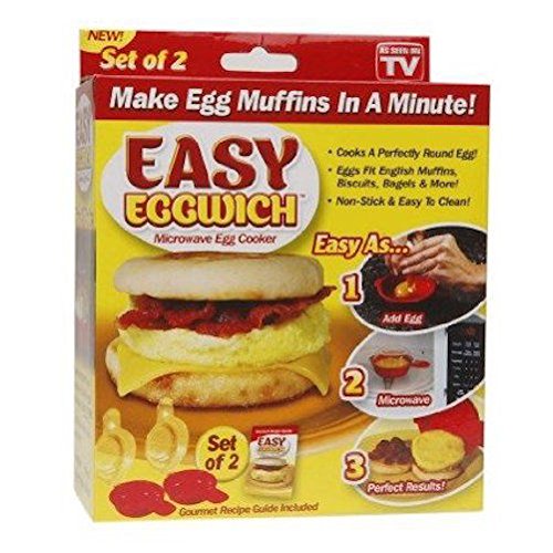 EASY EGGWICH EASY EGGWICH MICROWAVE EGG COOKER-JUST ADD EGG MICROWAVE FOR 1 MINUTE, AND GET A PERFECTLY COOKED ROUND EGG THAT FITS ON ENGLISH MUFFINS, BISCUITS,BAGELS AND MORE. NON-STICK.SET OF 2 The item comes in Mail order packaging. This listing is for clear.