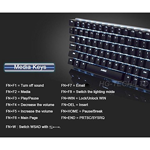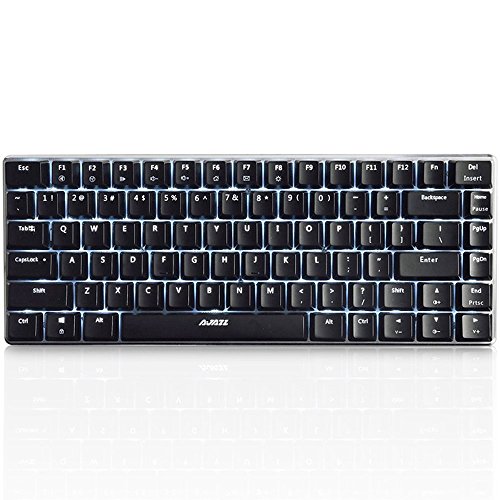 -. Feature : 82 Keys Anti-ghosting: Allows multiple keys to work simultaneously with high speed. Each key is controlled by independent switch, let you enjoy high-grade games with fast response, Great for gamers, typist, programmer, writer etc. / Blue Switch: Giving you a clicky and tactile feedback, it provides great tactile feel, sensitive and responsive. 60 million times keystroke test, 55+/-20 grams keystroke force and 2.2+/-0.6mm keystroke travel, perfect for typing working, also suitable for gaming. / Media Keys Design: With FN+F1/F2/F3/F4/F5/F6/F7/F8/F9/F10/F11/F12, easy to access to calculator, email, web browser, volume, media etc. Compact dimension size down the entire keyboard and navigate it easily, it can also save the space on your desk. / Ergonomic Design: Compact dimensions size down the entire keyboard and navigate it easily, It can also save the space on your desk. Ergonomic arc and slope, when you use this keyboard, your hands are not easily get fatigue. The included keycap puller makes cleaning or changing keycaps easier. / Durability & Compatibility: Laser carving character key for longtime using. Made of top-grade ABS and metal material, with matte-finish texture, it is sturdy and robust. Support computer system including Windows10,Windows 8, Windows 7, Mac OS X, Windows XP, Windows VISTA, etc.