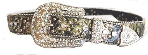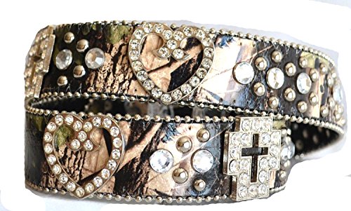 Binding : Apparel Product Description Beautifully made belt. Western faux leather upper and genuine leather backing camo print design rhinestone cross, heart metal conchos and studs accent belt. Removable buckle set. All the rhinestones and studs riveted and conchos screwed through the belt. 0