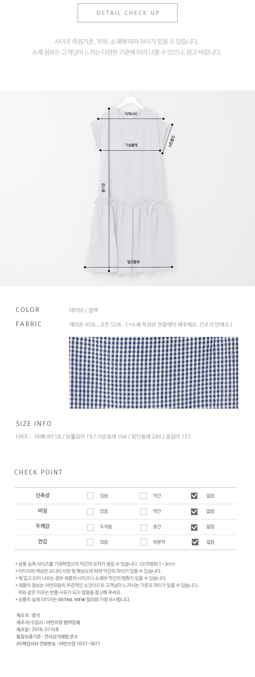 어깨선을 덮는 캡소매와 여유있는 핏에밑단의 프릴로 덧대어진머메이드 핏의 썸머 원피스랍니다레이온,코튼 혼방으로 가볍고 시원하며미세한 엠보가 느껴지는 지지미 소재로몸에 붙지않고 쾌적한 소재감이기분좋은 아이템이에요넉넉한 핏과 팔의 군살을 커버해주는캡소매 라인에 앞,뒤 언발의 풍성한플레어라인이 잘 어우러져 에쁜 원피스에요***소재 특성상 찬물세탁해주세요, 건조기 안돼요~~!색상은 네이비, 블랙사이즈는 FREE 44~77