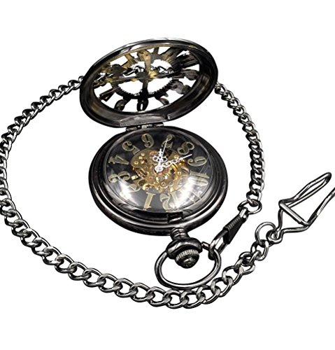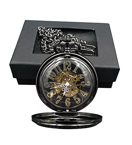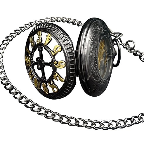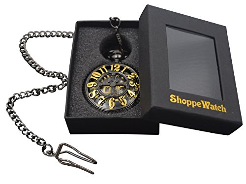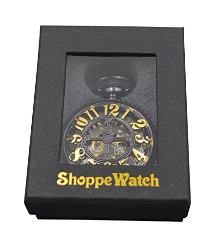 -. Feature : Black Pocket Watch Gold Arabic Numbers / Black Dial with Easy Read Gold Roman Numerals / Half Hunter Hand-Wind Mechanical Movement Reloj Skeleto / Great item for Gift Giving / Comes in 'ShoppeWatch' Brand Gift Box