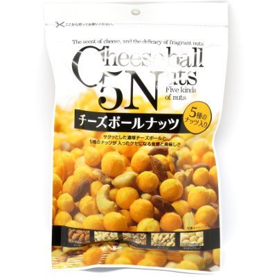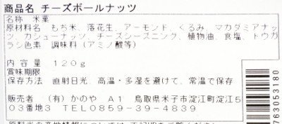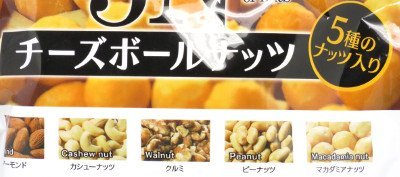 原材料:もち米、落花生、アーモンド、くるみ、マカダミアナッツ、カシューナッツ、チーズシーズニング、植物油、食塩、トウガラシ色素、調味料(アミノ酸等)