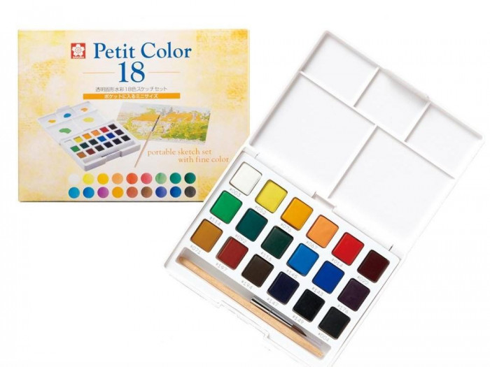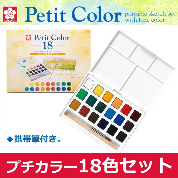 | 発色に優れた固形水彩絵の具18色がセットになりました。携帯に便利なポケットサイズのプチカラーシリーズです。 |