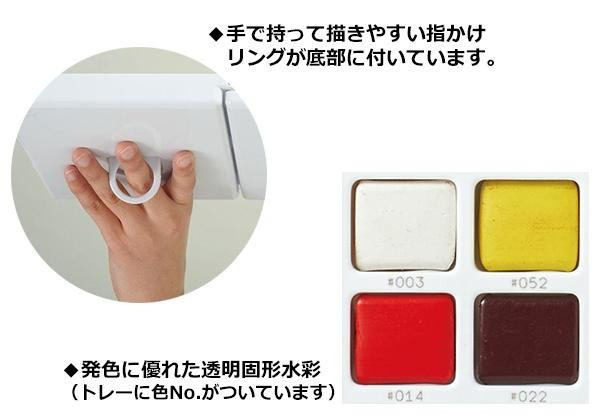 | 素材・材質 | 絵具:顔料、水溶性樹脂、湿潤材 ケース:ABS、中仕切り:PS 筆穂先:馬毛、筆軸:PBT |