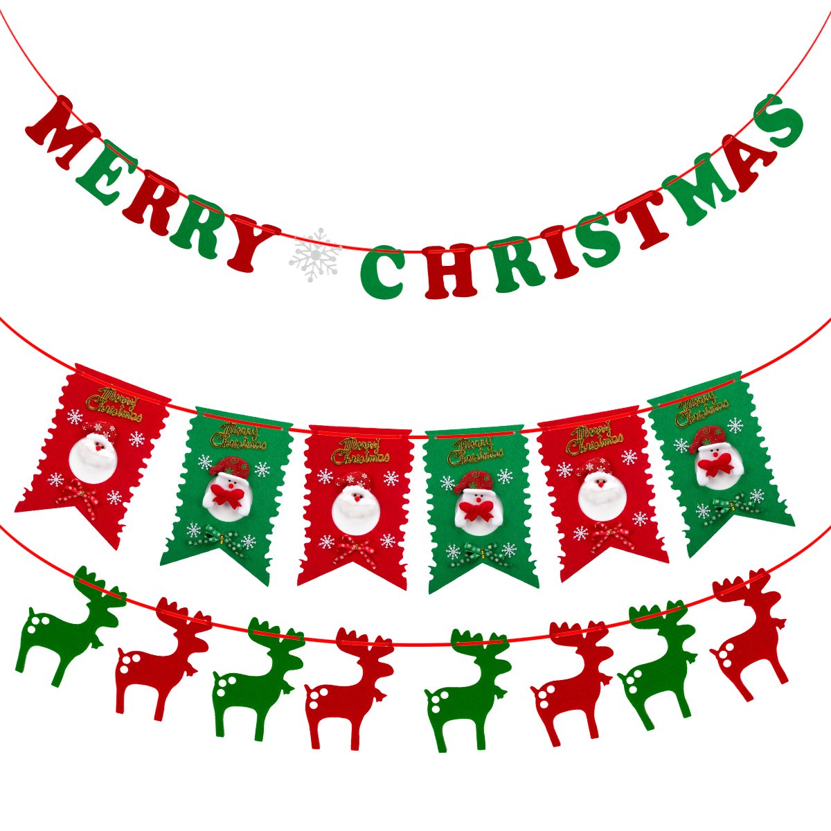 【3種類装飾バナー】アルファベット( MERRY CHRISTMAS):15個、各サイズ/17*14cm、ロープの長さ:300cm、サンタクロース:6個、各サイズ/30*20cm、ロープの長さ:200cm、トナカイ:8個、各サイズ:20*15cm、ロープの長さ:200cm