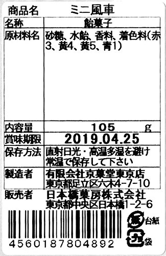原材料:砂糖、水飴、香料、着色料(黄4、黄5、青1、赤3)