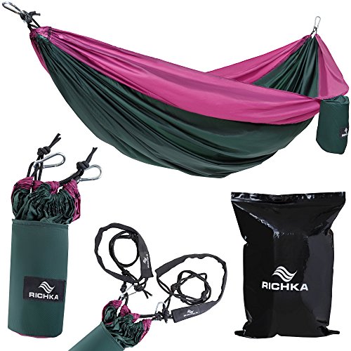 RICHKA Double Camping Hammock-70 D Diamond Ripstop Nylon, 118"L x 78"W, Lightweight Parachute Portable Outdoor for Hiking-Travel-Beach-Yard, Support Up To 800lbs with 2 Tree Straps+2 steel carabiners