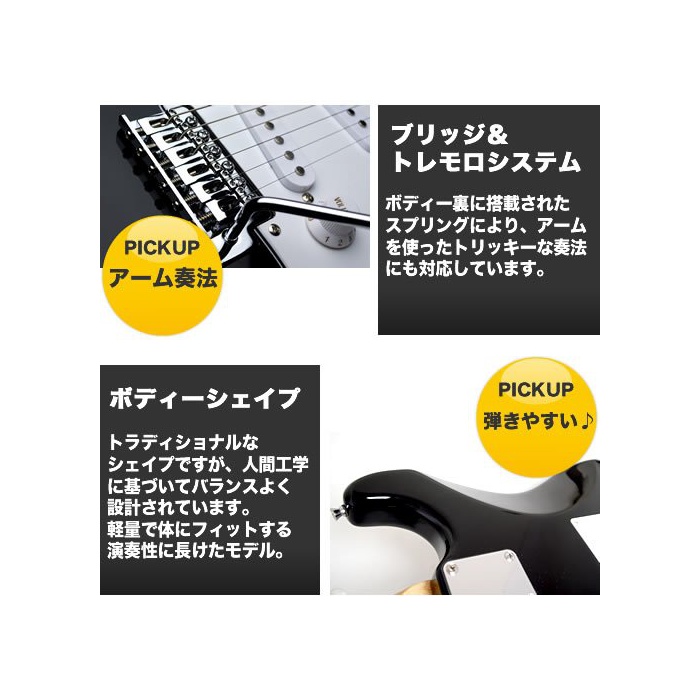 누구라도 본 것이 있는 정평(스테디셀러) 스트라토 캐스터 타입!스탠다드인 바디 사이즈와 넥의 굵음은 초심자에게도 추천입니다.3픽업을 탑재하고, selector에 최대5음색으로 변환이 가능♪물론 tremolo 암 표준 장비로《아민구》주법도 가능!