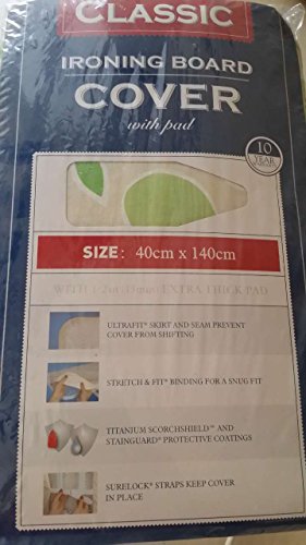 -. Binding : Kitchen -. Brand : J&J home fashion -. Color : Blue Silcone Coating -. EAN : 6915214200105 -. Feature : Fits 13-15" x 53-55" board Standard-size ironing board -- Solid Blue Color / Heavy use - designed for iron twice a week / Deluxe double-thick foam-fiber pad / Double coated: Titanium Scorchshield and Stainguard Protective Coating / 10-year fit guarantee -. IsAutographed : 0 -. Label : JJ home fashion -. Manufacturer : JJ home fashion -. PackageQuantity : 1 -. ProductGroup : Home -. ProductTypeName : HOME -. Publisher : JJ home fashion -. Size : 13"-15" wide and 53"-54" long -. Studio : JJ home fashion -. Title : J&J Home fashion heavy Use Ironing Board cover and pad spots