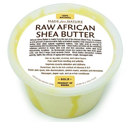 African Shea butter is a natural paste extracted from the nut (fruit) of the African Shea tree found mainly in Western Africa. It contains a rich amount of irremovable fatty acid which renders it far superior to Cocoa Butter and other natural vegetable butters. This fatty acid is crucial to rejuvenating and moisturizing the skin. Shea butter provides all essential vitamins needed to make the skin look and feel smoother, softer and most importantly healthier. Its therapeutic properties protect the skin from wind, coldmsun and it helps heal wounds faster. Shea butter stimulates cellular activity, fights the effects of aging and repairs rough, damaged skin. When pure and unrefined, it has a yellowish texture and gives out a nutty fragrance. Shea butter is most extensively used all over the world for its proven moisturizing and healing properties. In order to get the most benefit it is best to use it unrefined as it loses some of its key healing properties during the refining process.Feature