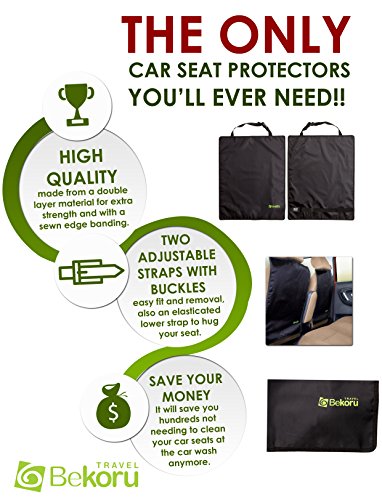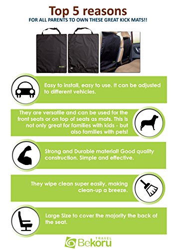 - Title : Premium Quality Kick Mats By Bekoru Travel * Large Car Seat Back Protectors 2 Pack. *Made Of Durable and Water Resistant Material *Protect Your Car Seat Backs From Dirt, Mud And Any Food Stains Left By The Kids*Two Adjustable Straps For Easy And Simple Fitting For Most Vehicles.*Great Gift For Parents * 100% Satisfaction Guarantee!