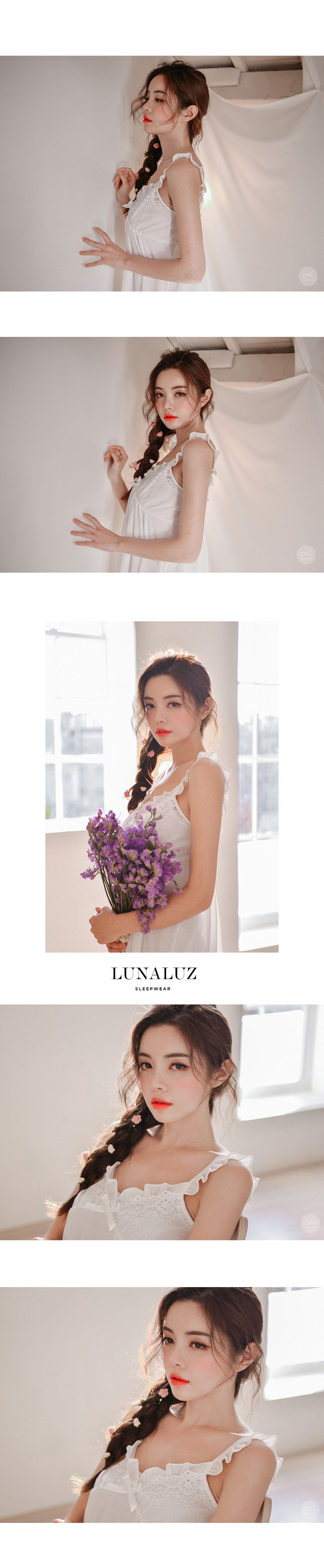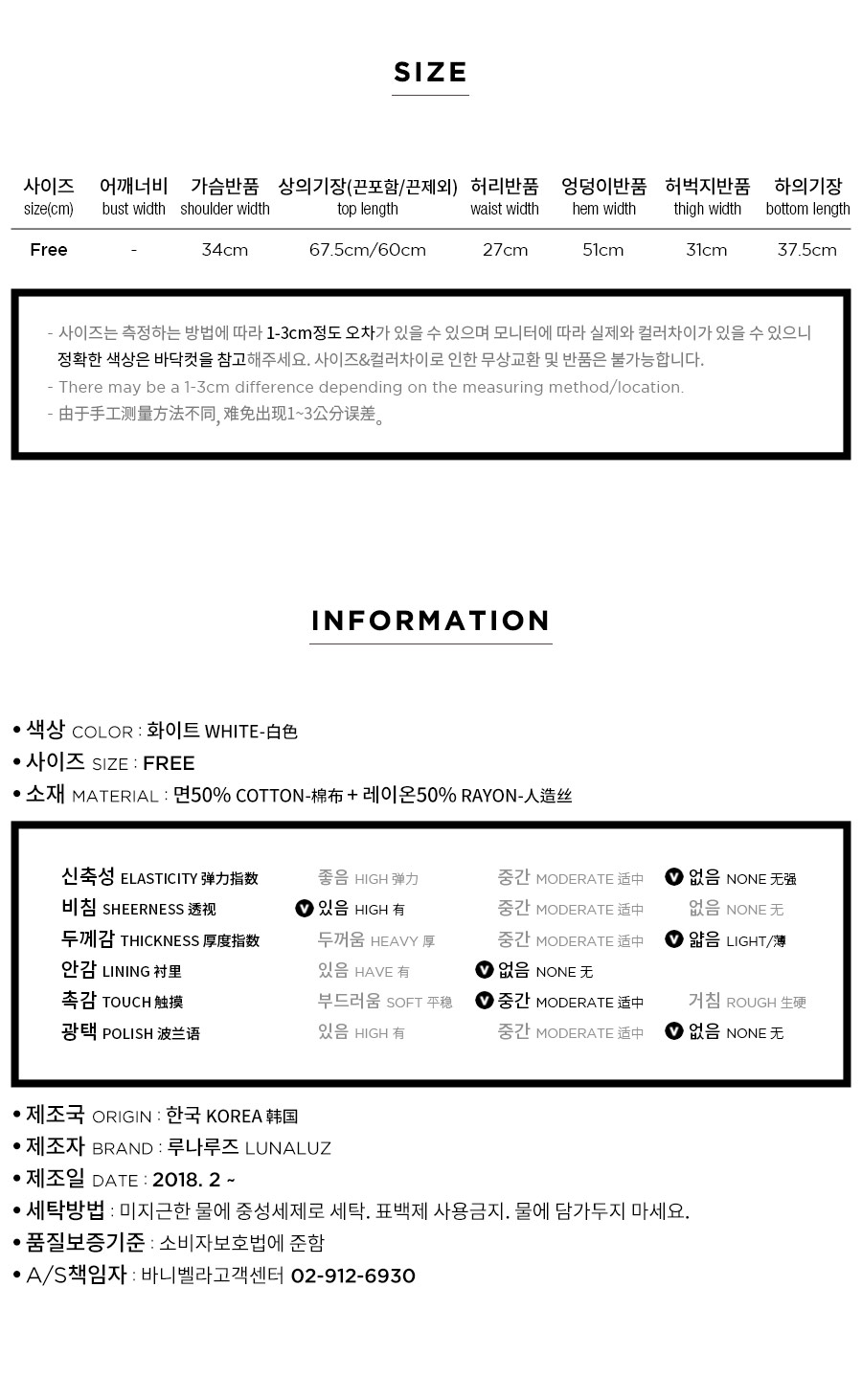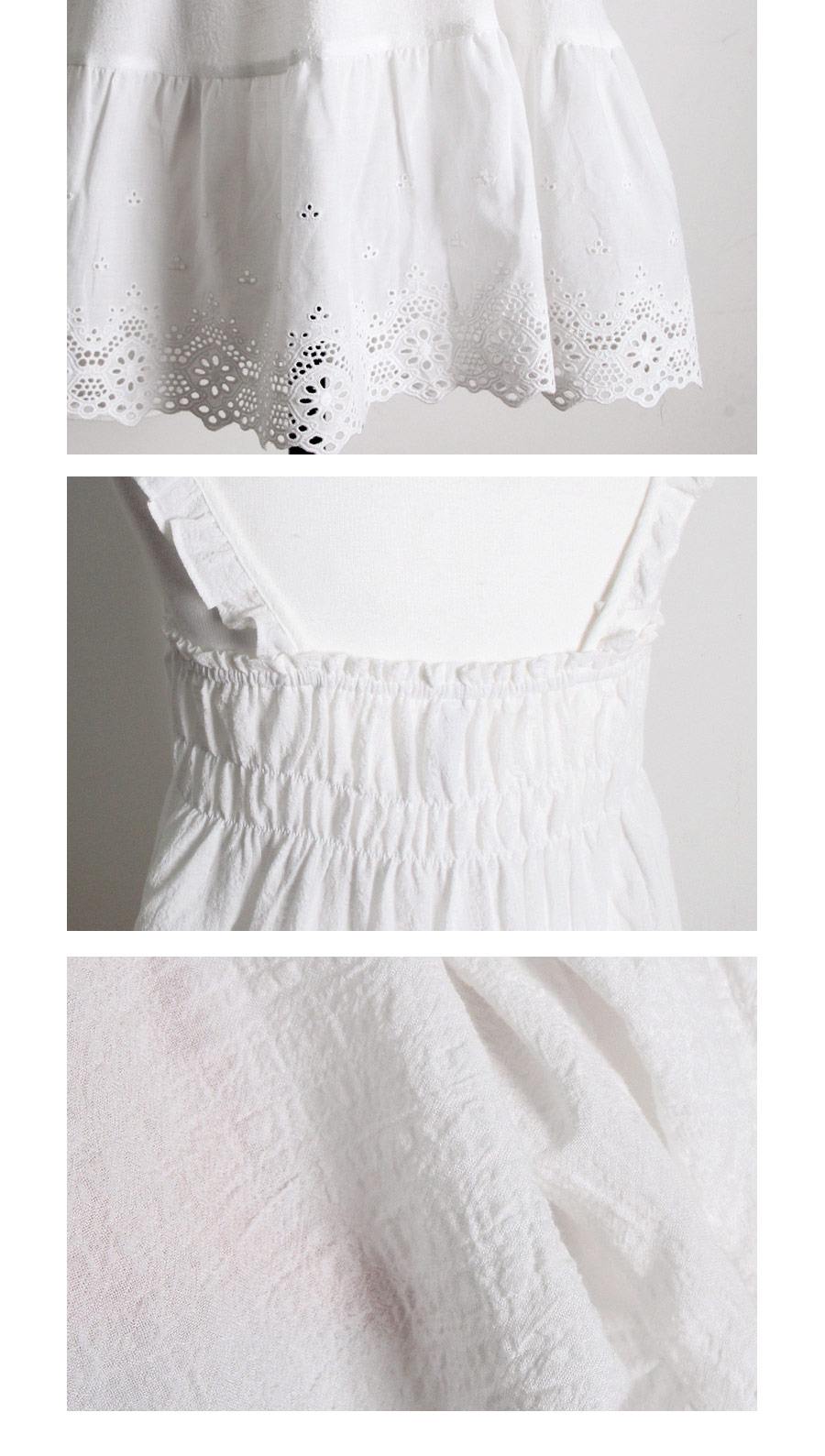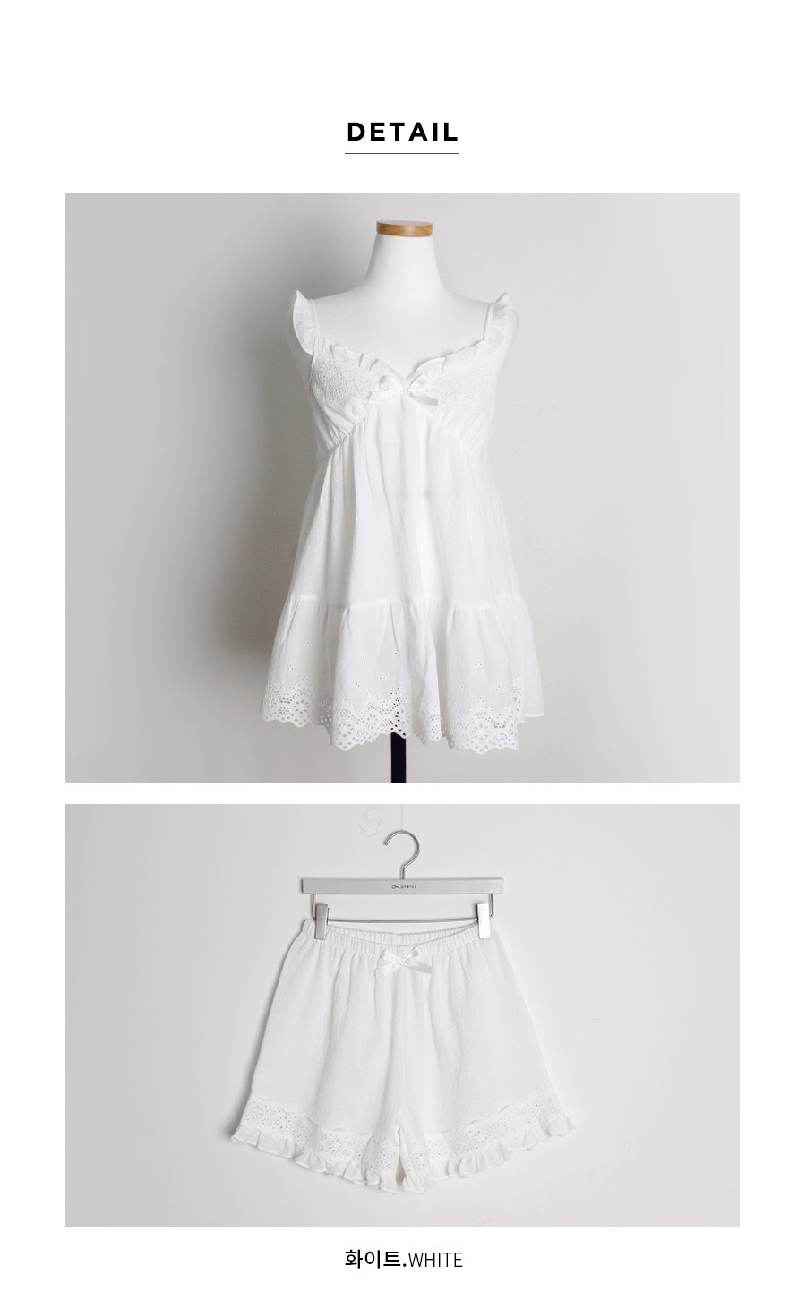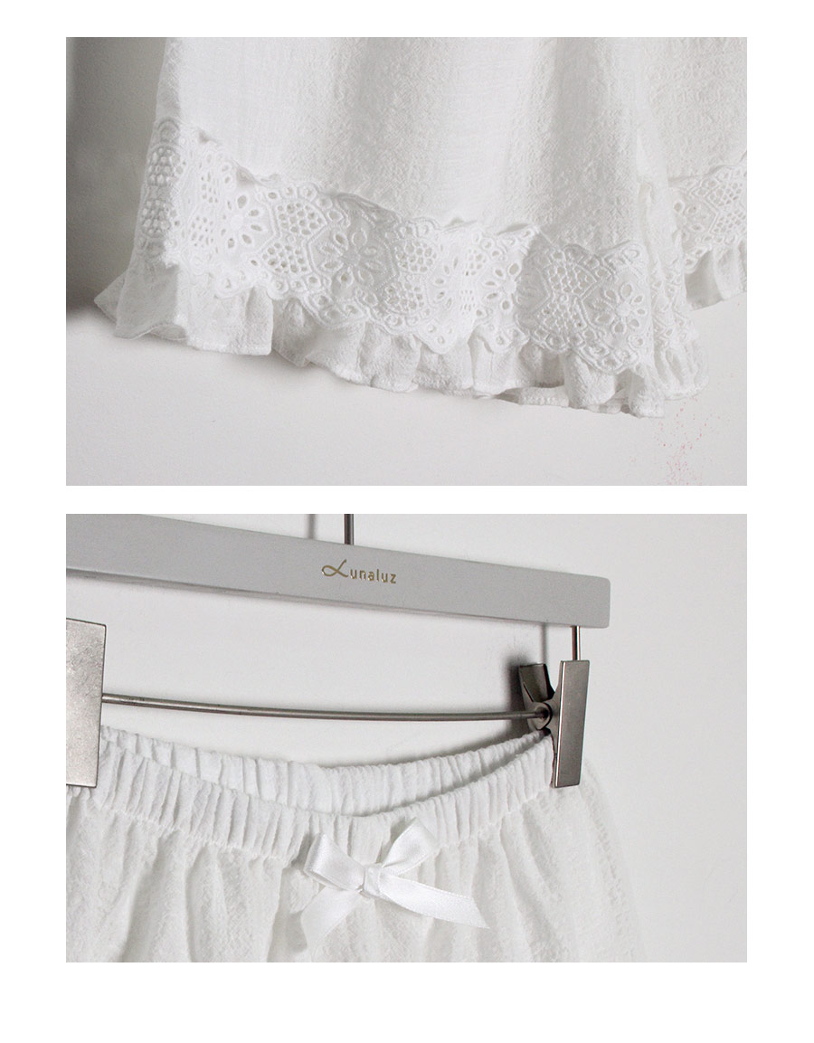 레이온 소재의 올록볼록한 텍스쳐가 시원하고 피부를 상쾌하게 해주는데요. 피부에 들러붙지 않고 통풍이 우수해 S/S 시즌에 입기 좋습니다. 아일렛 펀칭 디테일이 여성스럽고 섹시한 분위기를 더해줍니다. 컬러는 퓨어한 아이보리 1가지 컬러로 회사합니다. 봄, 여름에 입기 좋은 가벼운 소재와 분위기로 추천해드리고 싶습니다. DETAIL 여리한 쇄골라인과 바스트 라인을 예쁘게 돋보이게 해주는 패턴으로 상품이 올라가자마자 반응이 좋았는데요. 어깨 스트랩부터 바스트 윗 선을 프릴 장식으로 봉제해 러블리함을 살려주었습니다. 바스트와 하단의 아일렛 펀칭 원단으로 섹시하고 페미닌한 무드를 느끼실 수 있습니다. A라인으로 퍼지는 패턴으로 뱃살은 가려주고, 여리한 느낌은 살려준답니다. 뒷 부분은 3중으로 밴딩 처리해서 안정감을 주었습니다. 상의의 기장은 힙을 덮어주는 긴 기장으로 제작하고, 하의는 3부 쇼츠 기장으로 제작해 발랄하고, 더욱 러블리하게 연출하실 수 있습니다. 하의의 하단에는 펀칭 면레이스를 봉제 해 디테일을 다시 한 번 살려주었습니다. 100% 국내 생산으로 봉제선이 깔끔하고, 디자인과 부자재, 소재의 퀄리티가 높습니다. SIZE 44반size~66size까지 커버 가능한 free사이즈입니다.