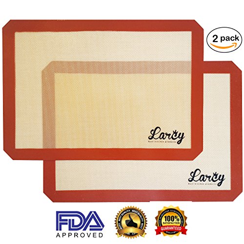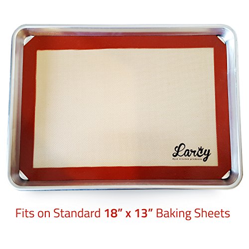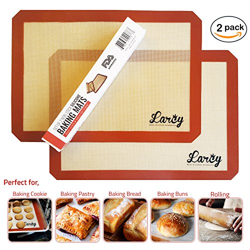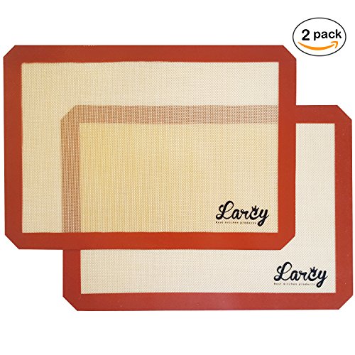 Studio : Larcy Publisher : Larcy Product Description Set of 2 Non-Stick Silicone Baking Mats ? 16 5/8" x 11 1/2" (42 cm x 29.5 cm) ? Fits on Standard 18" x 13" Baking Sheets ? Mat thickness is 0.75 mm ? Keeps Baking Sheets Clean and Protected ? No Need for Parchment or Wax Paper ? Heat Resistant to 450°F ? 100% Food Grade Silicone ? Eco Friendly Alternative to Aluminum Foil ? Non-stick Finish Allows Food to Slide off Easily ? Flavors or Odors will not penetrate the Baking Mats ? Even Heat Transfer, Perfect Bake Every Time ? Ideal for Baking, Roasting and Warming ? FDA Approved; BPA Free; Easy to clean; Simply use a little soap, warm water and sponge then let it air dry Durable and Long lasting; Can be used thousands of times NON-STICK EASY-TO-CLEAN PERFECT, CONSISTENT RESULTS: Silicone/fiberglass hybrid construction helps to distribute heat evenly along the entire baking surface ? Be careful not to use sharp objects on the mat ? Never use as a cutting surface ? Let air-dry before storing 0