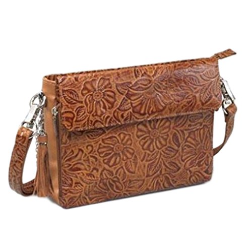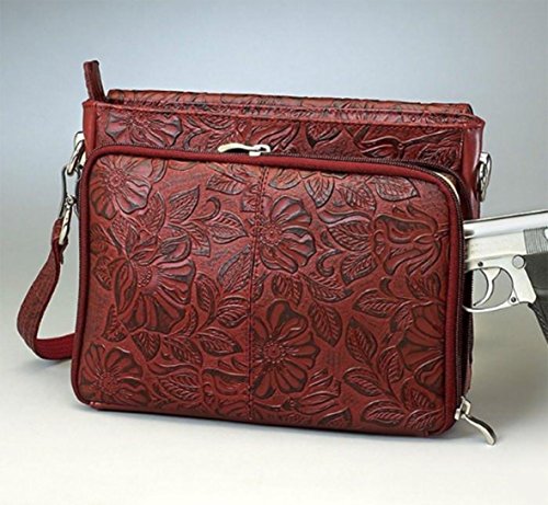 This concealed carry leather shoulder bag from Gun Tote'n Mama's is a beautiful vintage wearable art! A hand carved mold creates this embossed understated rose leaf pattern on American cowhide leather. Hand rubbed color creates graceful multi-tone highlights. This bag will age to a darker patina that becomes softer with use. The gun compartment was designed for either left or right handed use and measures 10" Wide x 4" Deep x 8". This pocket opens on 3 sides and includes a holster that is adjustable to your most comfortable draw angle. It fits small to medium framed handguns. The adjustable strap (shortest -12", longest- 25") has the wire-reinforced SLASH RESISTANT shoulder strap. A detachable leather tassel adds a touch of bling. The top zippered main compartment holds daily necessities (wallet, phone, etc) and includes a side pocket and a zippered privacy pocket. The outside, magnetic flap covers an organizer that side zippers for easier access to the card slots and slot pockets. Purses Dimensions: 11" Wide x 8" Tall x 3.5" DeepFeature