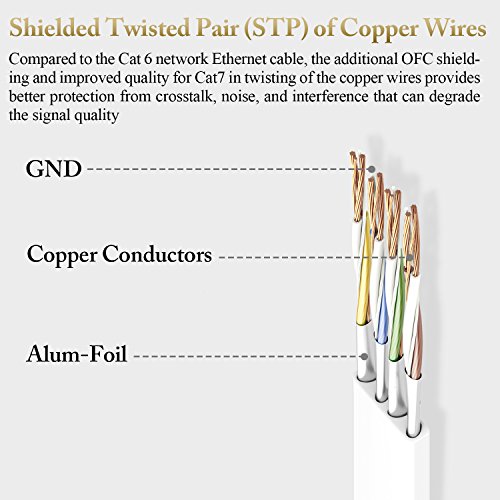 HIGHER SPEED&NO INTERFERENCE: Made of 4 shielded twisted pair (STP) of copper wires with 8 Gold Contact Pins on each end support up to 10 gigabits/600MHz per second(4 times the bandwidth of Cat6 cable),which guarantee better protection from crosstalk,noise, and interference that can degrade the signal quality