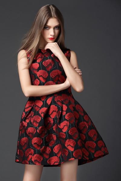 個性的な花柄デザイン ジャガード ノースリーブAラインワンピース/ XL