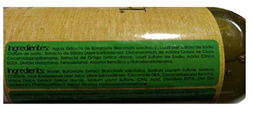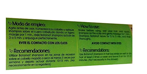 SHAMPOO BATAMO-T 100% natural Batamote leaf extract, aloe vera, nettle. BENEFITS: Free of parabens It works in women and men Prevents hair loss It stimulates their growth Results from the first bottle HOW TO USE: Shake to mix extracts Pour shampoo in your hand and apply on the scalp A light massage with your fingertips and let stand at least 3 minutes rinse thoroughly RECOMMENDATIONS: Wet hair before bathing Apply shampoo Batamo-T in areas of recession Let stand for 10 minutes while performing some other activity SHAMPOO BATAMO-T Producto 100% natural Extracto con hoja de batamote, aloe vera, ortiga. BENEFICIOS: Libre de parabenos Funciona en mujeres y hombres Previene la caída del cabello Estimula su crecimiento Resultados a partir de la primera botella MODO DE EMPLEO: Agite para mezclar bien sus extractos Vierta shampoo en su mano y aplique sobre el cuero cabelludo De un ligero masaje con la yema de sus dedos y deje actuar al menos 3 minutos Enjuague perfectamente RECOMENDACIONES: Humedezca el cabello antes de bañarse Aplique shampoo Batamo-T en las zonas de recesión Deje actuar durante 10 minutos mientras realiza alguna otra actividadFeature