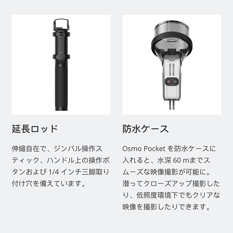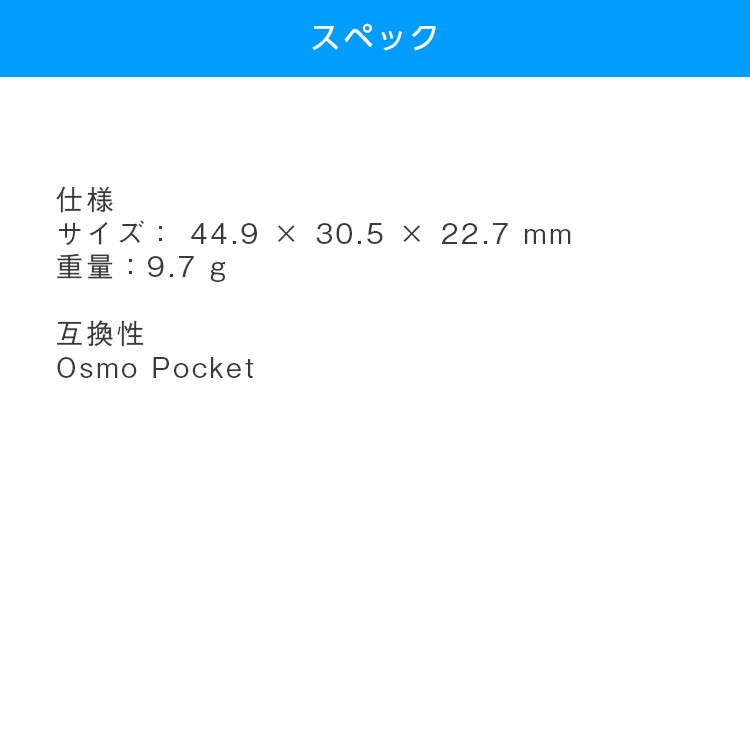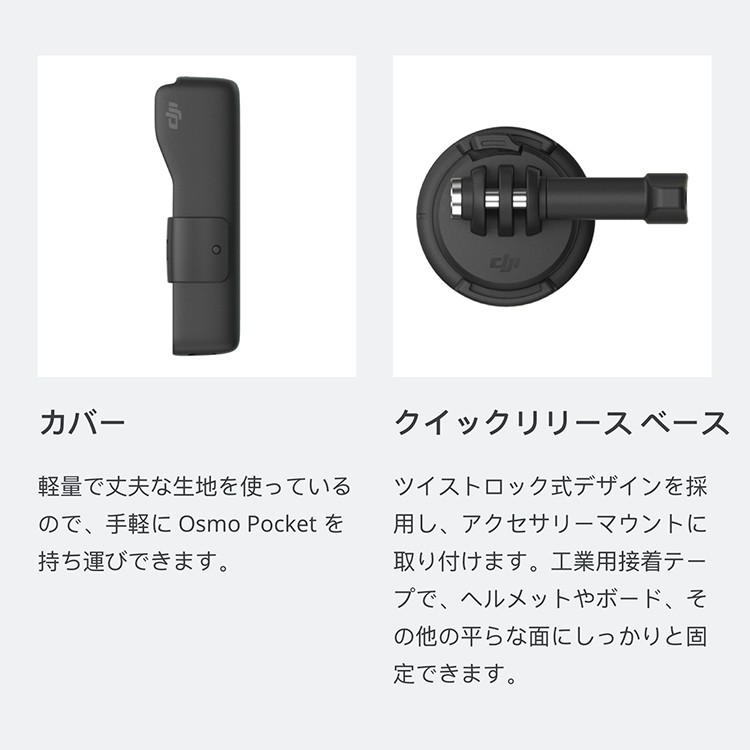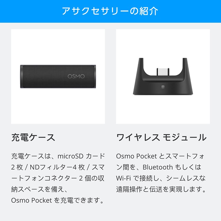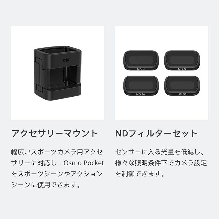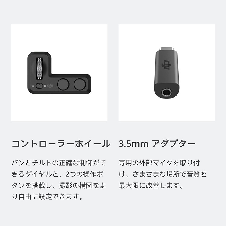 Osmo Pocket オスモポケットとは・・・ DJI史上最小の3軸スタビライザーを搭載する高性能でコンパクトサイズな Osmo Pocketは、 すべてのシーンを輝く瞬間として記録するハンドヘルドカメラです。 主な特徴 ・携帯しやすい軽量設計 ・4K 60fps ・メカニカルジンバルスタビライザー ・インテリジェントな撮影機能 ・様々なアクセサリー ・最大稼働時間 140分 ■本製品の説明 概要 パンとチルトの正確な制御ができるダイヤルと、2つの操作ボタンを搭載し、 撮影の構図をより自由に設定できます。 ハイライト 正確なジンバル制御 ジンバルモードを素早く切り替え 同梱物 コントローラーホイール × 1 仕様 サイズ: 44.9 × 30.5 × 22.7 mm 重量:9.7 g 互換性 Osmo Pocket 【その他アクセサリーの紹介】 ・充電ケース 充電ケースは、microSDカード2枚/NDフィルター4枚/スマートフォンコネクター2個の 収納スペースを備え、Osmo Pocketを充電できます。 ・ワイヤレス モジュール Osmo Pocketとスマートフォン間を、BluetoothもしくはWi-Fiで接続し、 シームレスな遠隔操作と伝送を実現します。 ・コントローラーホイール パン&チルトの正確な制御ができるダイヤルと、2つの操作ボタンを搭載し、 撮影の構図をより自由に設定できます。 ・クイックリリース ベース ツイストロック式デザインを採用し、アクセサリーマウントに取り付けます。 工業用接着テープで、ヘルメットやボード、その他の平らな面にしっかりと固定できます。 N・Dフィルターセット センサーに入る光量を低減し、様々な照明条件下でカメラ設定を制御できます。 ・3.5mm アダプター 専用の外部マイクを取り付け、さまざまな場所で音質を最大限に改善します。 ・スマートフォン アダプター スマートフォンアダプタ(Lightning、USB-C)を使用すると、お使いのスマートフォンと Osmo Pocketを接続。DJI Mimoアプリを使用して、より快適に操作できます。 ・防水ケース Osmo Pocketを防水ケースに入れると、水深60 mまでスムーズな映像撮影が可能に。 潜ってクローズアップ撮影したり、低照度環境下でもクリアな映像を撮影したりできます。 ・カバー Osmo Pocketをしっかりと保護し、外出先や移動中でも安全に保管できます。 |