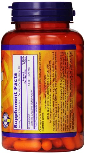 -. Binding : Health and Beauty -. Brand : Now Sports -. EAN : 0733739020550 -. Feature : This patented ph-buffered formula is stable throughout the GI tract / Creatine has also been shown to support mental acuity and muscular endurance and strength while supporting a healthy body composition / Creatine intrinsically supports muscular growth -. IsAdultProduct : 0 -. IsAutographed : 0 -. IsMemorabilia : 0 -. Label : Now Foods -. LegalDisclaimer : PLEASE NOTE: Product image is representative of the product offered but may not have the exact attributes. Please read product description for the specific attributes of this product. The information above is intended for reference only. While we attempt to keep our information accurate, we cannot guarantee it is an accurate representation of the latest formulation of the product. If you have any concerns, please visit the vendor's web site. The information above are the views of the product's manufacturer, not the views of Nutrition Supply Company. -. Manufacturer : Now Foods -. Model : 733739020550 -. MPN : 2055 -. NumberOfItems : 1 -. PackageQuantity : 1 -. PartNumber : 2055 -. ProductGroup : Health and Beauty -. ProductTypeName : HEALTH_PERSONAL_CARE -. PublicationDate : 2013-07-04 -. Publisher : Now Foods -. ReleaseDate : 2013-07-01 -. Size : 120 -. Studio : Now Foods -. Title : NOW Sports Kre-Alkalyn(R) Creatine 750 mg, 120 Capsules -. UPC : 733739020550