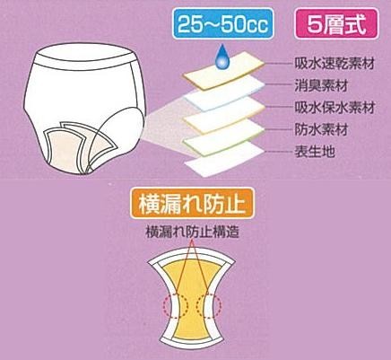 | 仕様 | 女性用 吸水量:50cc スピード消臭 横漏れ防止 5層 洗濯可(乾燥機不可) |