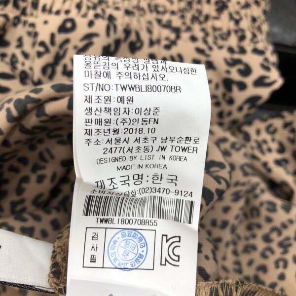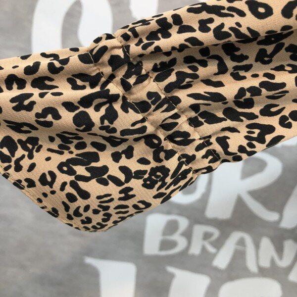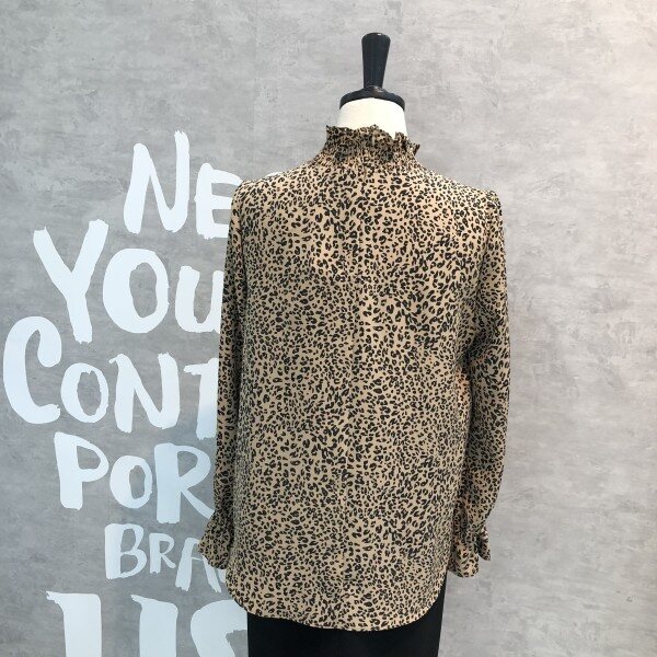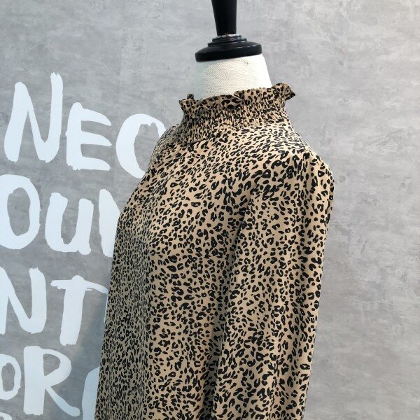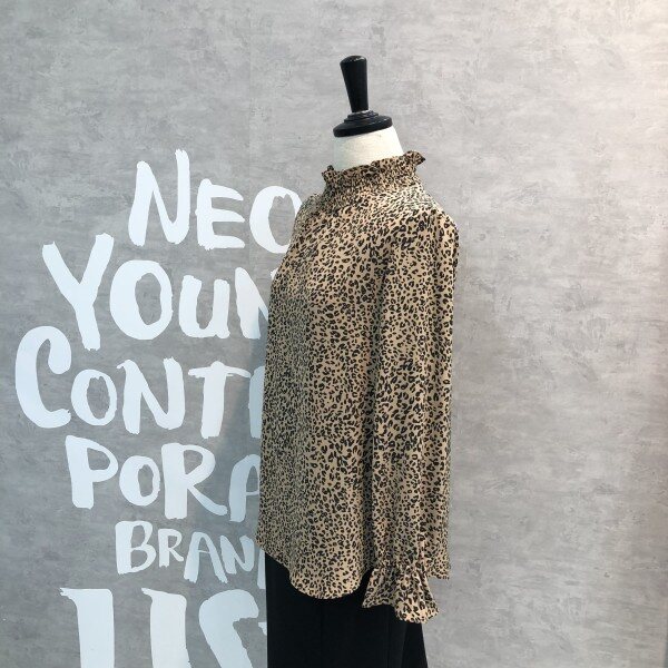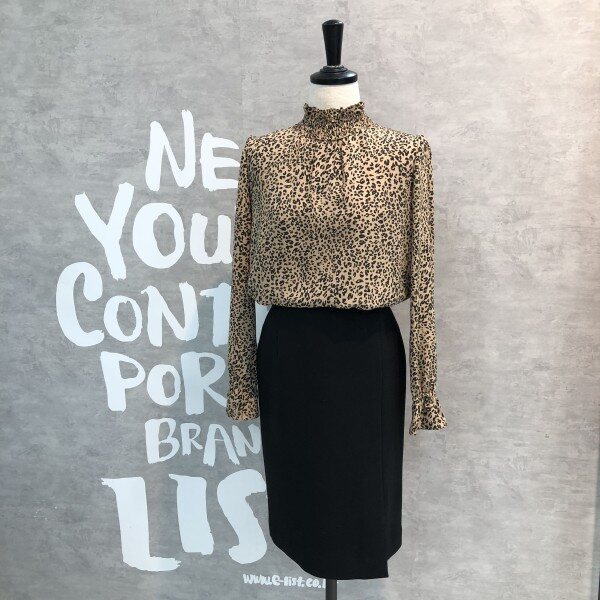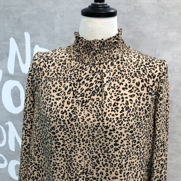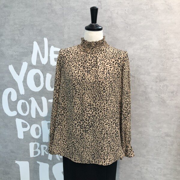 레오파드 패턴이 트렌디하며 스모크 밴딩의 하이 네크라인이 페미닌한 블라우스입니다