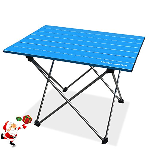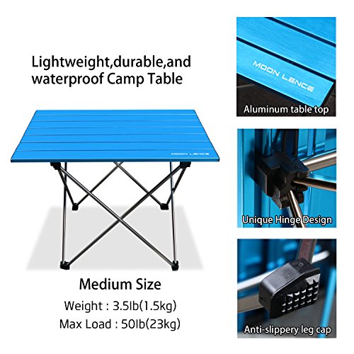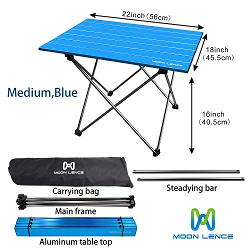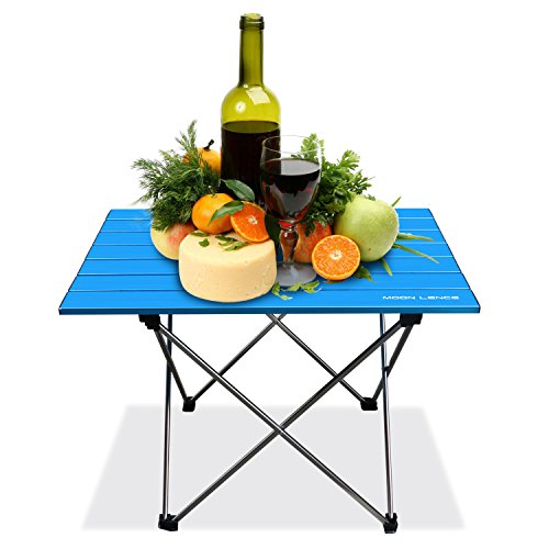Product Description From picnic to river trips, Moon Lence Portable Camping Table makes it all possible on your adventures. It is surely the most reliable folding table that you can trust and here is why... - More sturdy construction than the competition. Both the top cloth and the aluminum holders are selected by premium suppliers. Buy with confidence! - It is a lightweight, portable table packed in a durable bag, so you don't need to take some bulks on your cars/RV. Enjoy a lightweight trip! - Features a waterproof and weather resistant design, this foldable table is particularly useful for camping, hiking, picnics and more. A MUST HAVE for any outdoor fan. - Moon Lence is always committed to provide our customer the best outdoor products, your satisfaction is the most important to us. All the items are LIFETIME guarantee! Specifications : Unfolded Size: 22 * 17 * 15 inches (Length*Width*Height) Storage Pouch: 23 * 3 inches(length * diameter) Material:Aluminum table top Frame: 7075 Aluminum alloy Weight Capacity: 33lbs/15kg Color: Blue,Black Package Includes: 1*Folding Table 1*Free Pouch Click "Add to Cart" To Get the Most Versatile Camp Table For Your Next Adventure!
